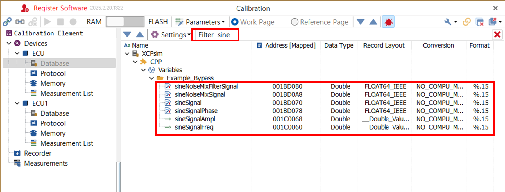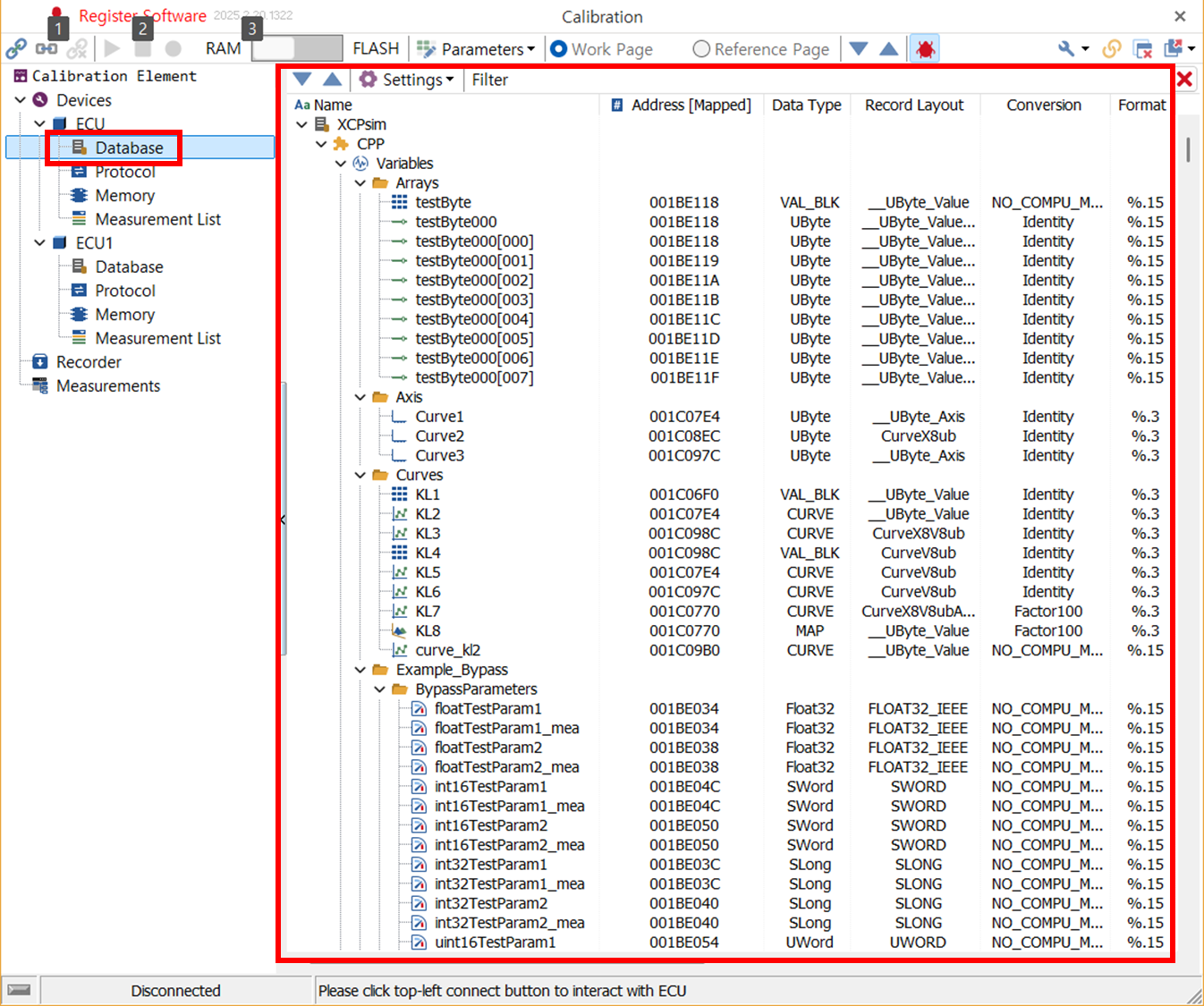 - Calibration 창의 왼쪽 캘리브레이션 요소에서 Devices/ ECU/ Database를 선택하면, 창의 오른쪽에 a2l에 포함된 정보를 볼 수 있다.