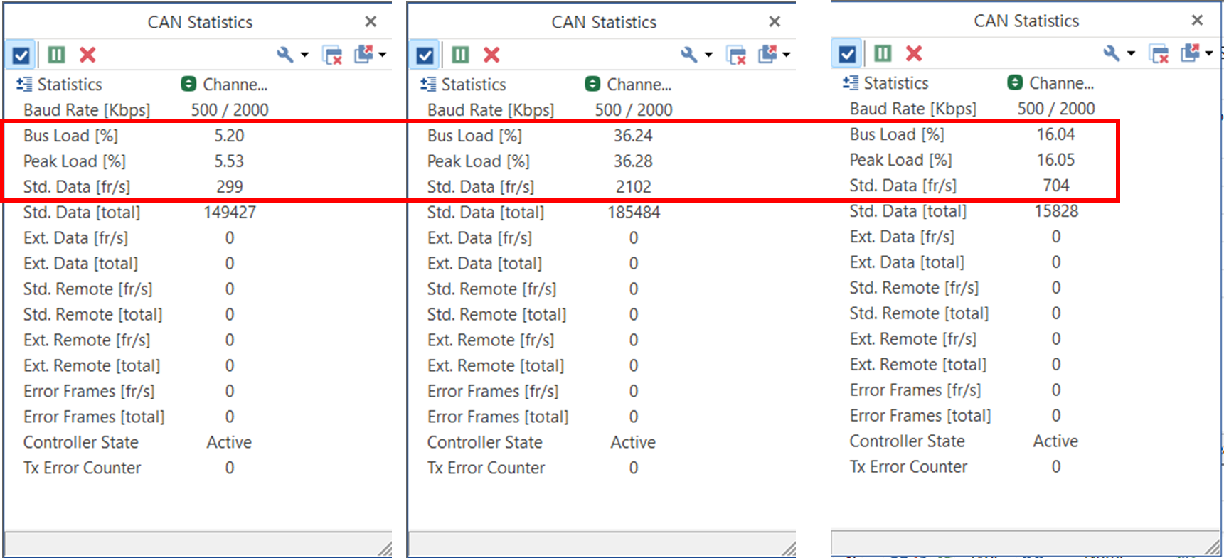 - 버스 로드를 비교하면 아래 그림과 같다. 왼쪽은 100ms 주기 polling, 가운데는 10ms polling, 오른쪽은 10ms cyclic의 경우이다.