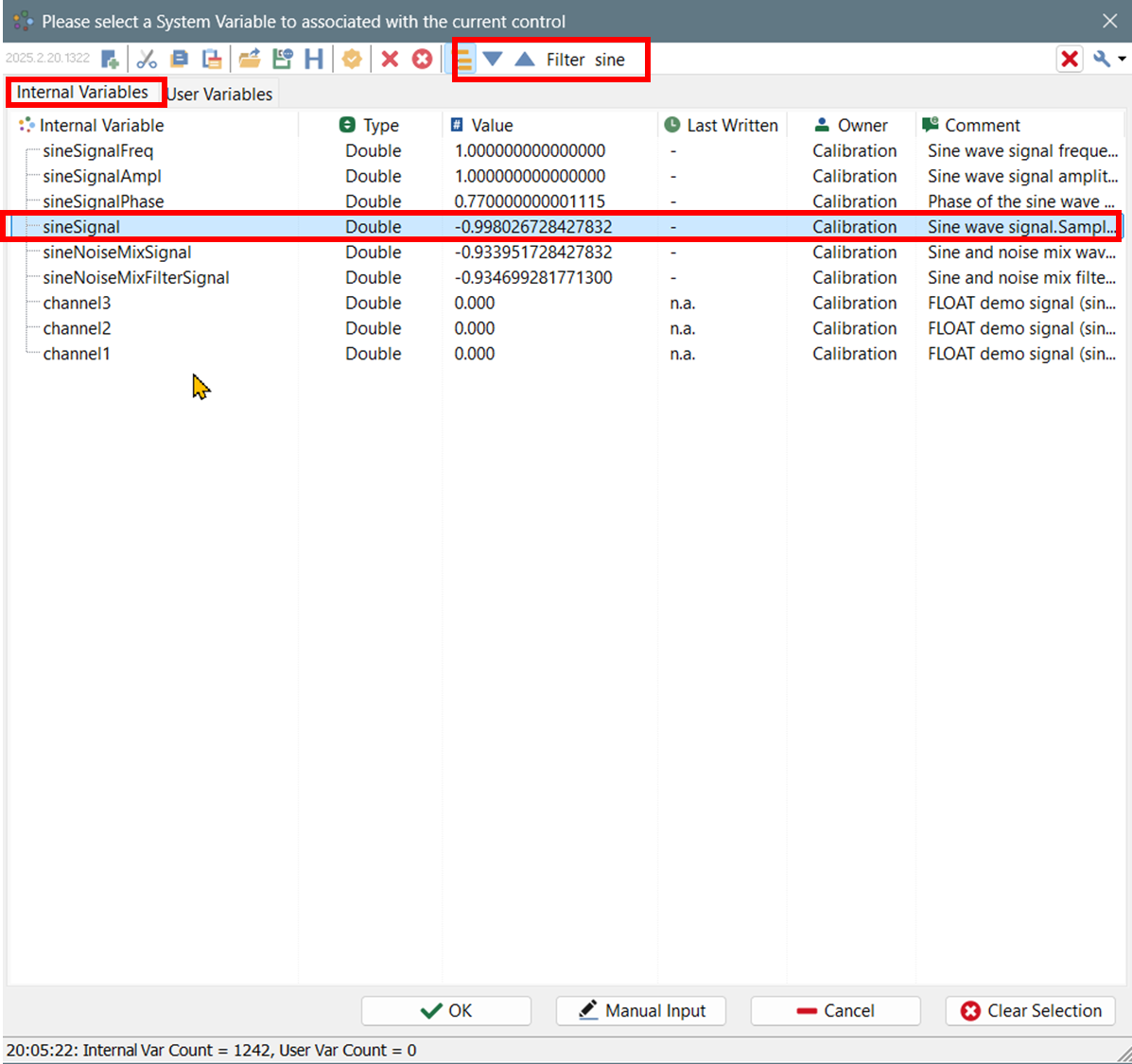 - 시스템 변수 선택창이 열린다. Internal Variables 탭을 선택한다. a2l에 있는 모든 변수들이 시스템 변수로 추가되어 있다. Filter 창에 sine이라고 입력한다. sineSingal을 선택한다.