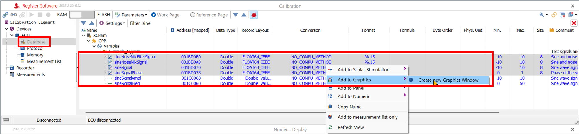 - Database에서 변수만 선택하고 마우스 우클릭으로 Add to Graphics/ Create new Graphics Window를 선택한다.