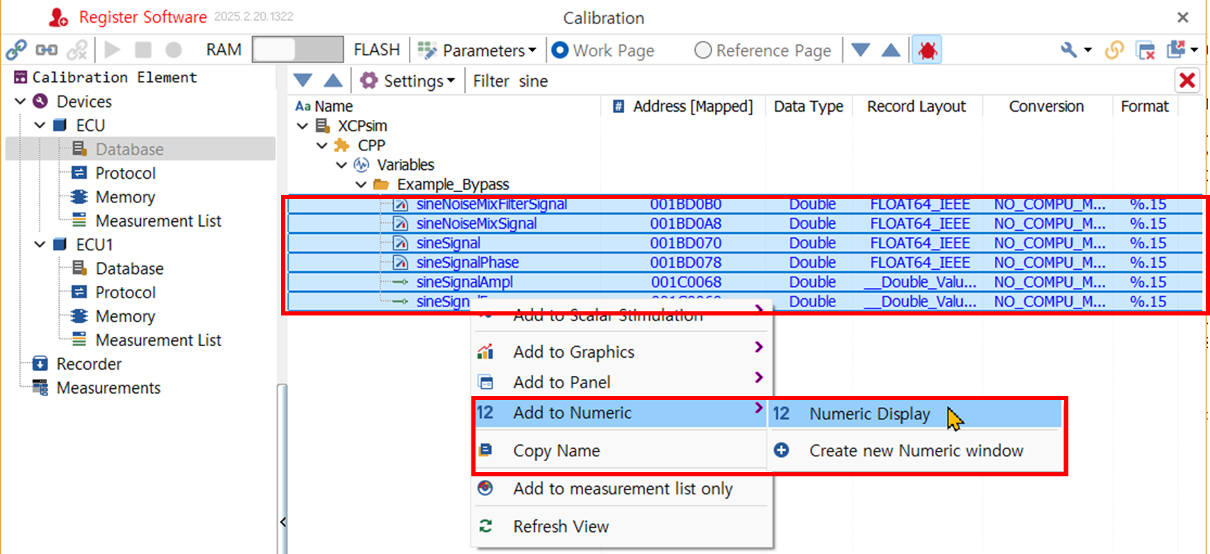 - Ctrl 키를 누른 상태에서 변수들을 클릭하여 여러 개 변수들을 선택할 수 있다. 변수들이 선택된 상태에서 마우스 우클릭으로 팝-업 메뉴를 띄운다. Add to Numeric/ Create new Numeric window 나 Numeric Display를 선택하여, 새 수치 표시창을 만들거나, 기존 수치 표시창에 변수들을 추가한다.