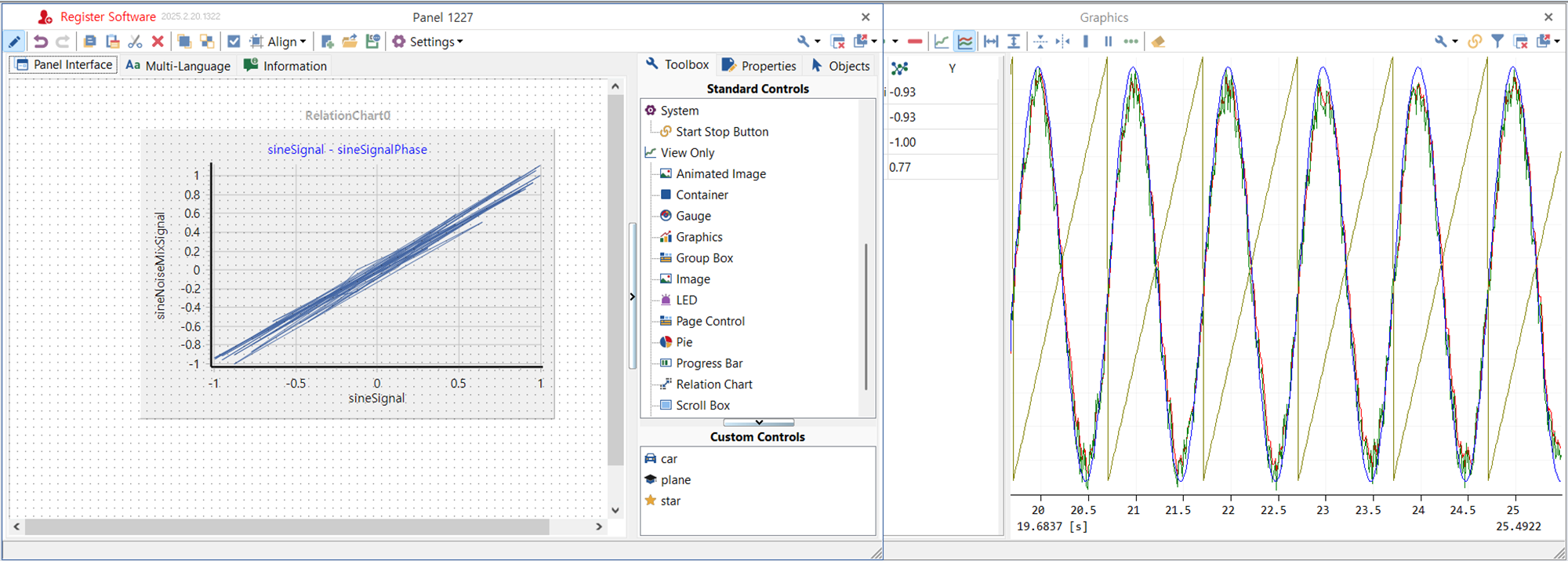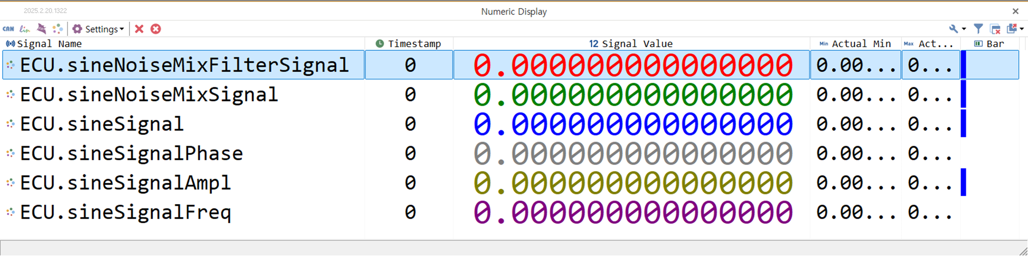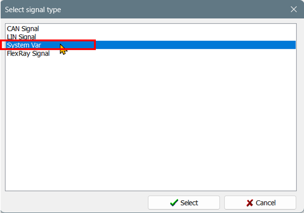 - y에 연결할 변수를 설정하기 위하여, EditSignalIndex를 1로하고 VarLink에서 오른쪽 3점 버튼을 클릭한다. 위와 동일한 방법으로 시스템 변수창에서 XCP로 전달받은 변수를 선택한다. 나는 sineNoiseMixSignal을 선택하였다.