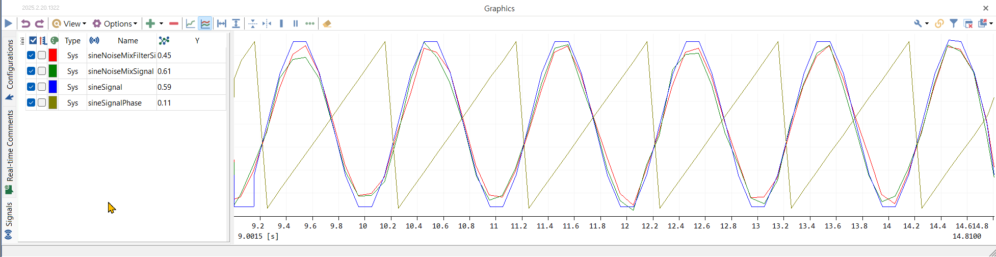 - 그래픽스창에 그래프가 출력된다. (아래 그림은 그래픽창에서 f 키를 눌러 스케일을 조정한 상태이다.) 파란색 sineSignal 그래프를 보면 매끈하지가 않다. 빨간색과 녹색 그래프에는 노이즈가 포함되어있는데, 파란색 그래프만큼 매끈해 보인다.