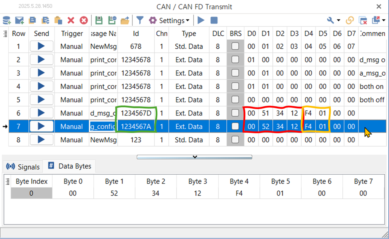 - TSMaster의 CAN Transmit 기능을 이용하여 0x1234567D, 0x1234567A 메시지를 전송하여 아이디와 전송 주기를 변경할 수 있다.
