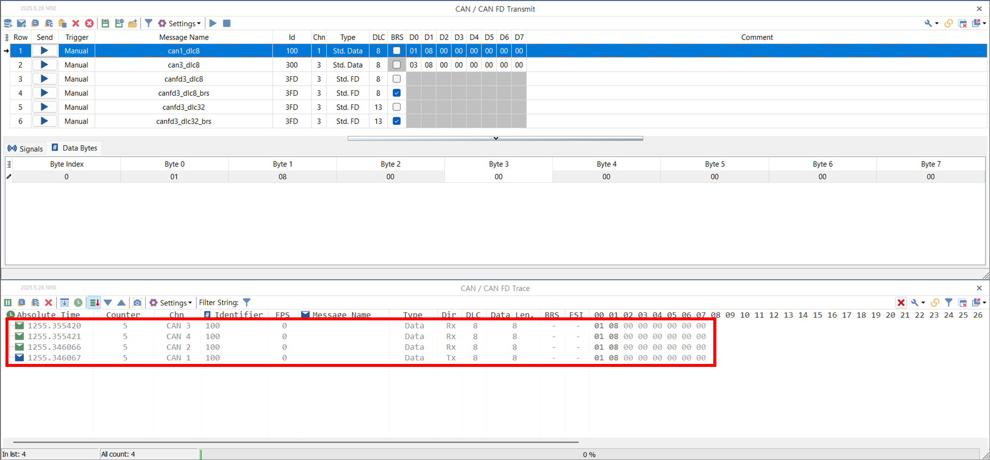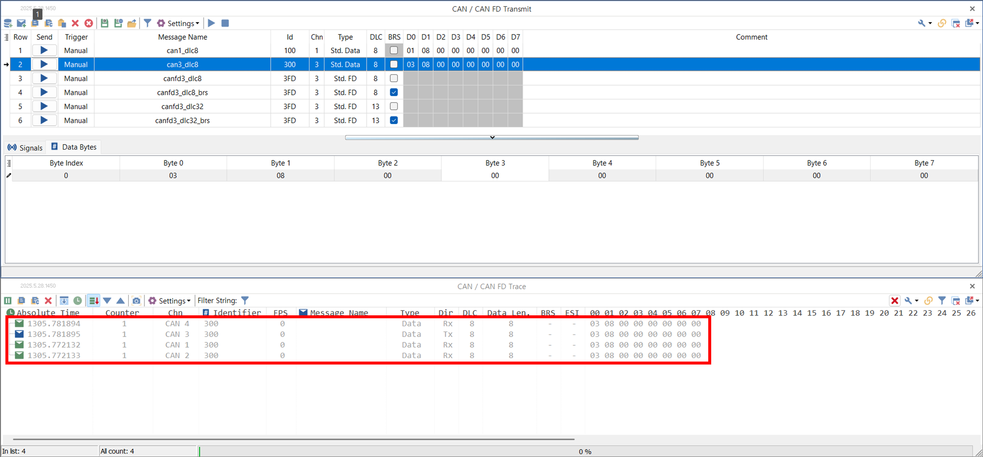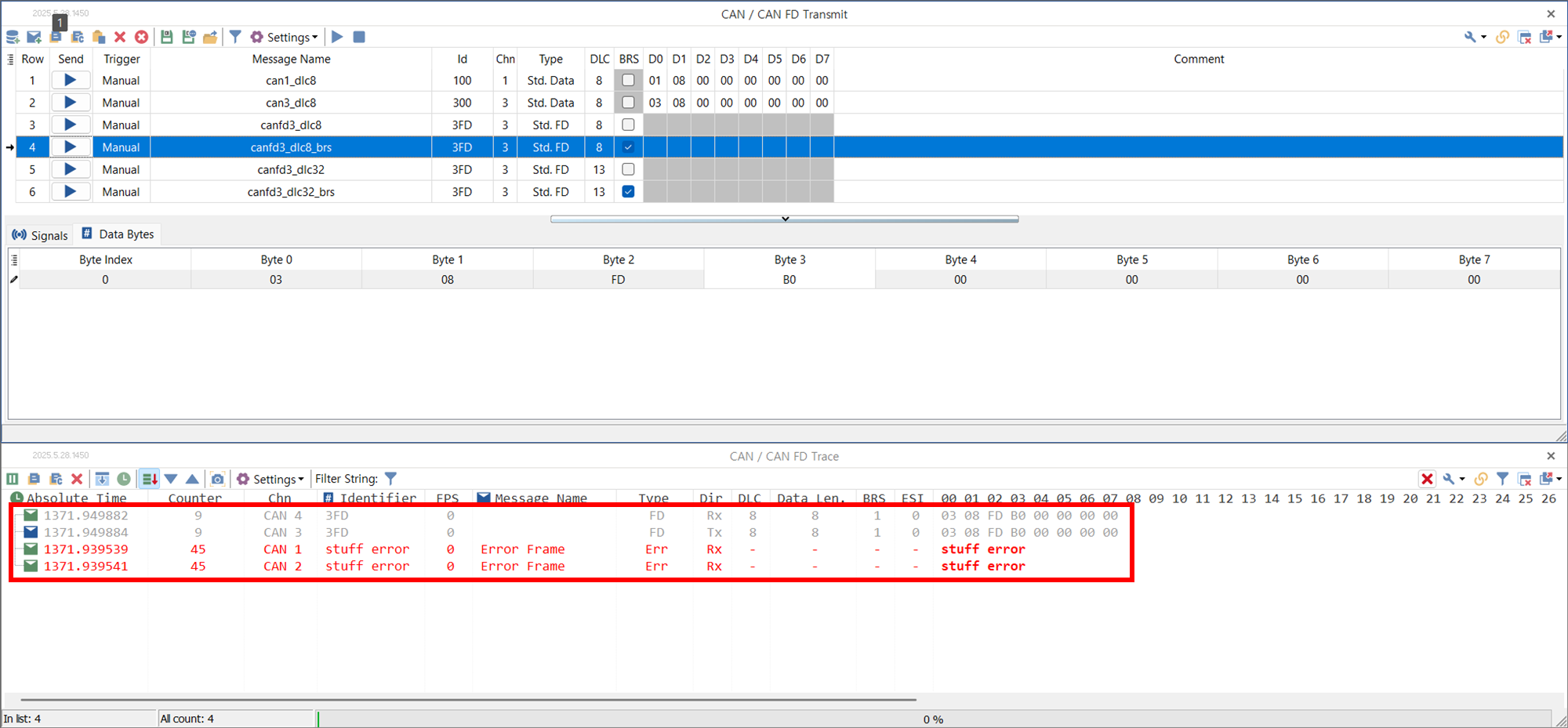 - 행 4: CAN-FD 제어기에서 8 바이트 CAN-FD 메시지 전송. 헤더와 데이터에 다른 전송 속도 (x 4) 적용