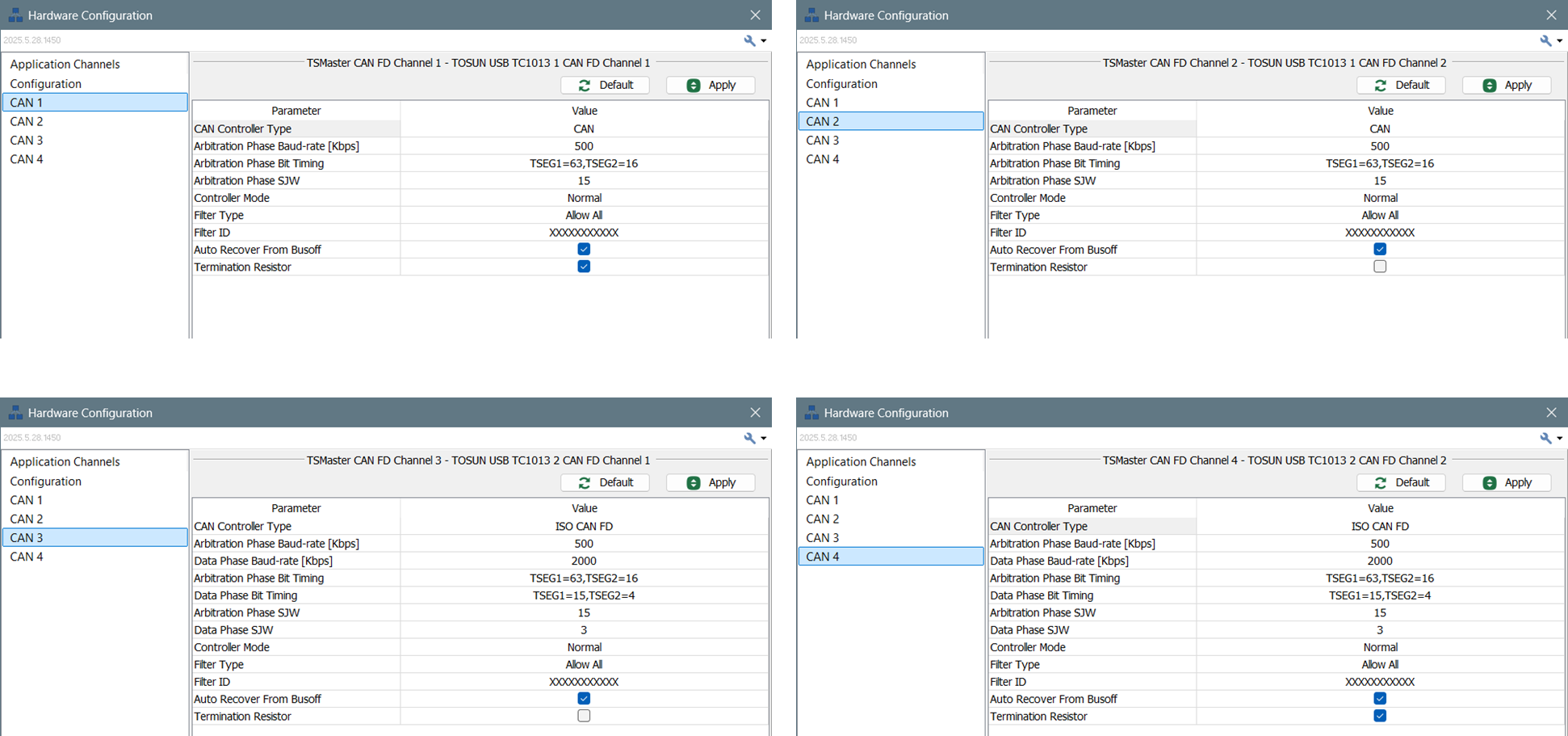 - 1번과 2번 채널은 CAN으로, 3번과 4번 채널은 CAN-FD로 설정한다.