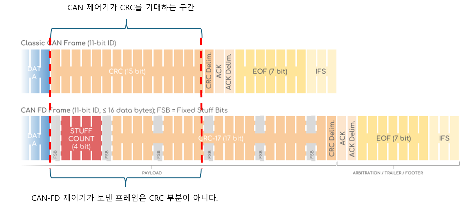 CAN 프레임과 CAN-FD의 구조 차이로 CRC 부분의 위치가 다르다. - CAN 제어기가 500kbps의 속도로 메시지를 처리하면서 CRC 부분을 처리하는 순간, 실제 CAN-FD 프레임은 CRC 부분이 아니다. CAN 제어기는 CRC 에러를 검출한다. 헤더에 CAN-FD 프레임 여부를 표시하는 비트가 있는데, 이 비트를 보고 CAN-FD 프레임을 처리하지 않을 수도 있겠지만 이렇게 구현되어 있다.