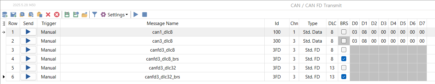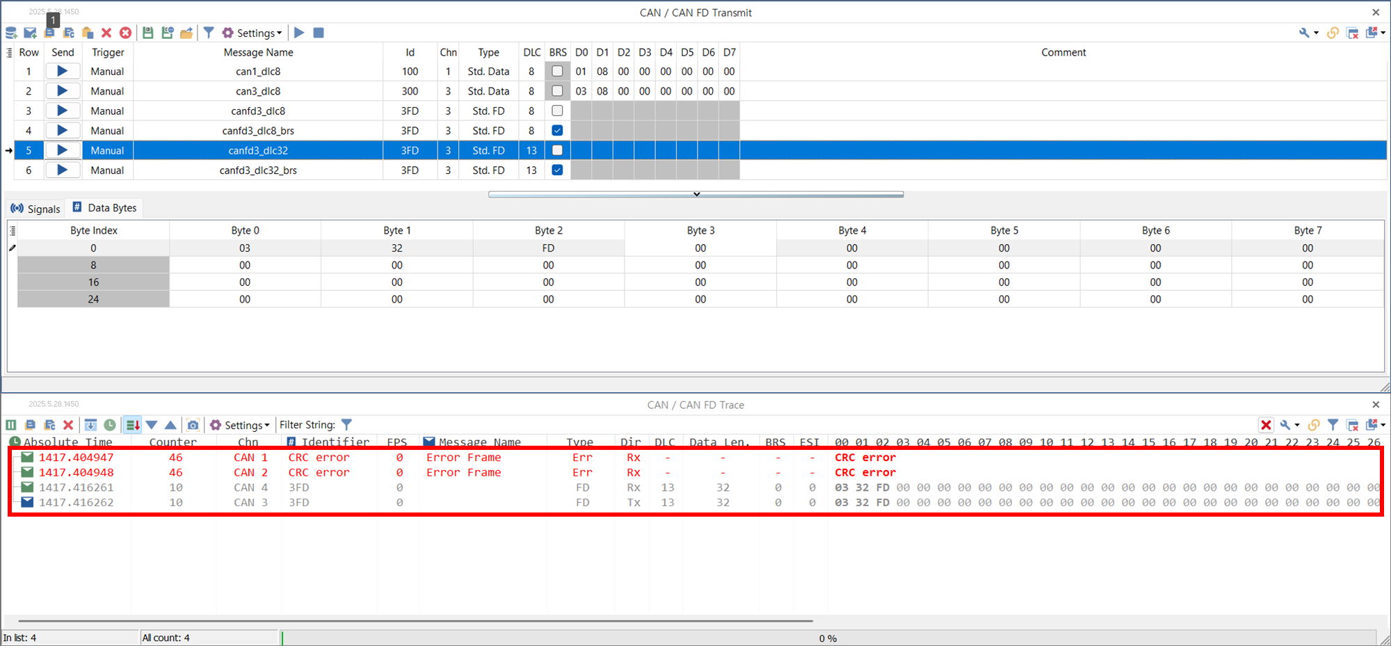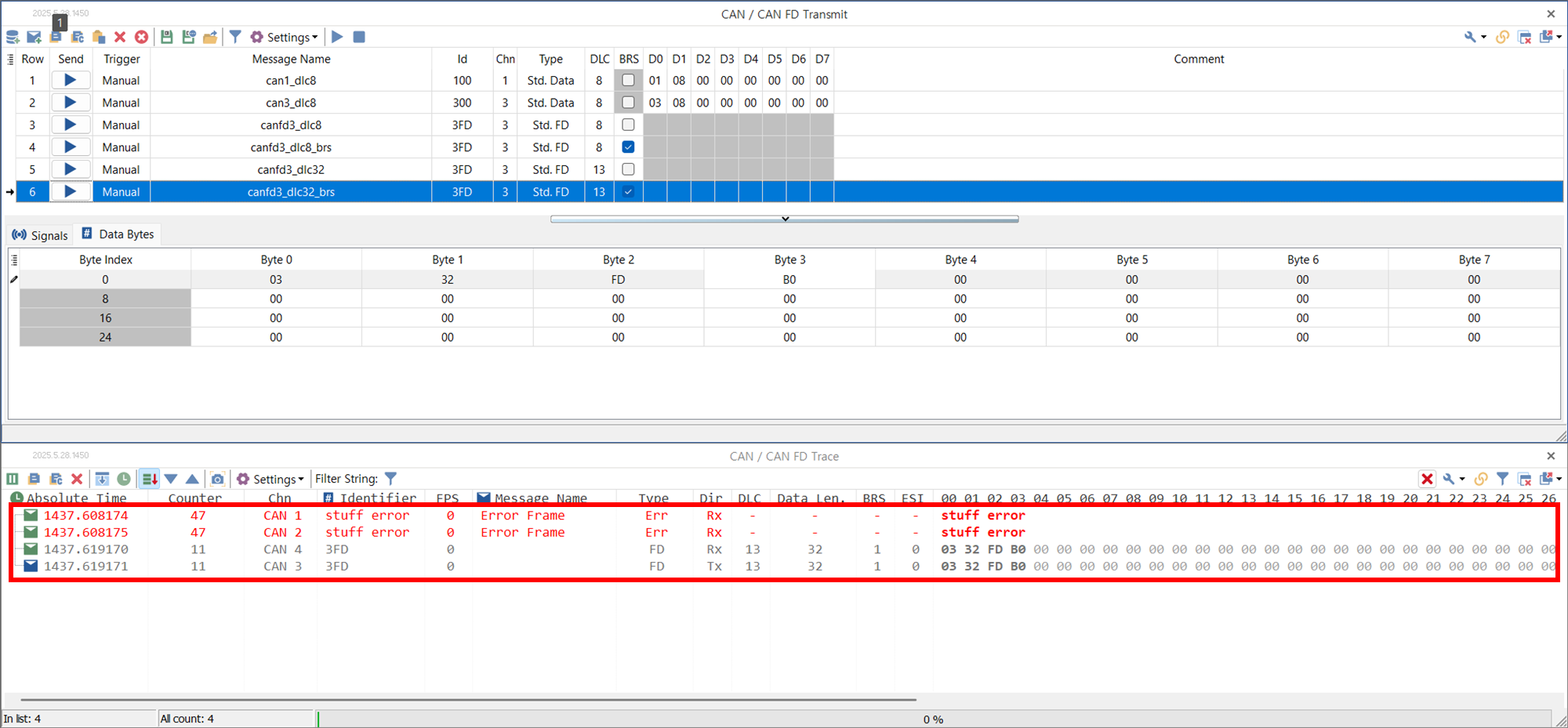 - 행 6: CAN-FD 제어기에서 32 바이트 CAN-FD 메시지를 전송. 헤더와 데이터에 다른 전송 속도 (x4) 적용