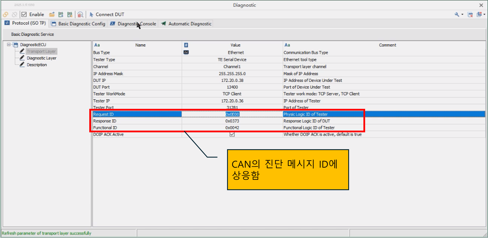 - Diagnostic 창에서 Protocol (ISO TP) 탭을 선택한다. 창의 왼쪽 영역의 DiagnosticECU 트리에서 Transport Layer를 선택한다. Bus Type에서 Ethernet을 선택한다.
