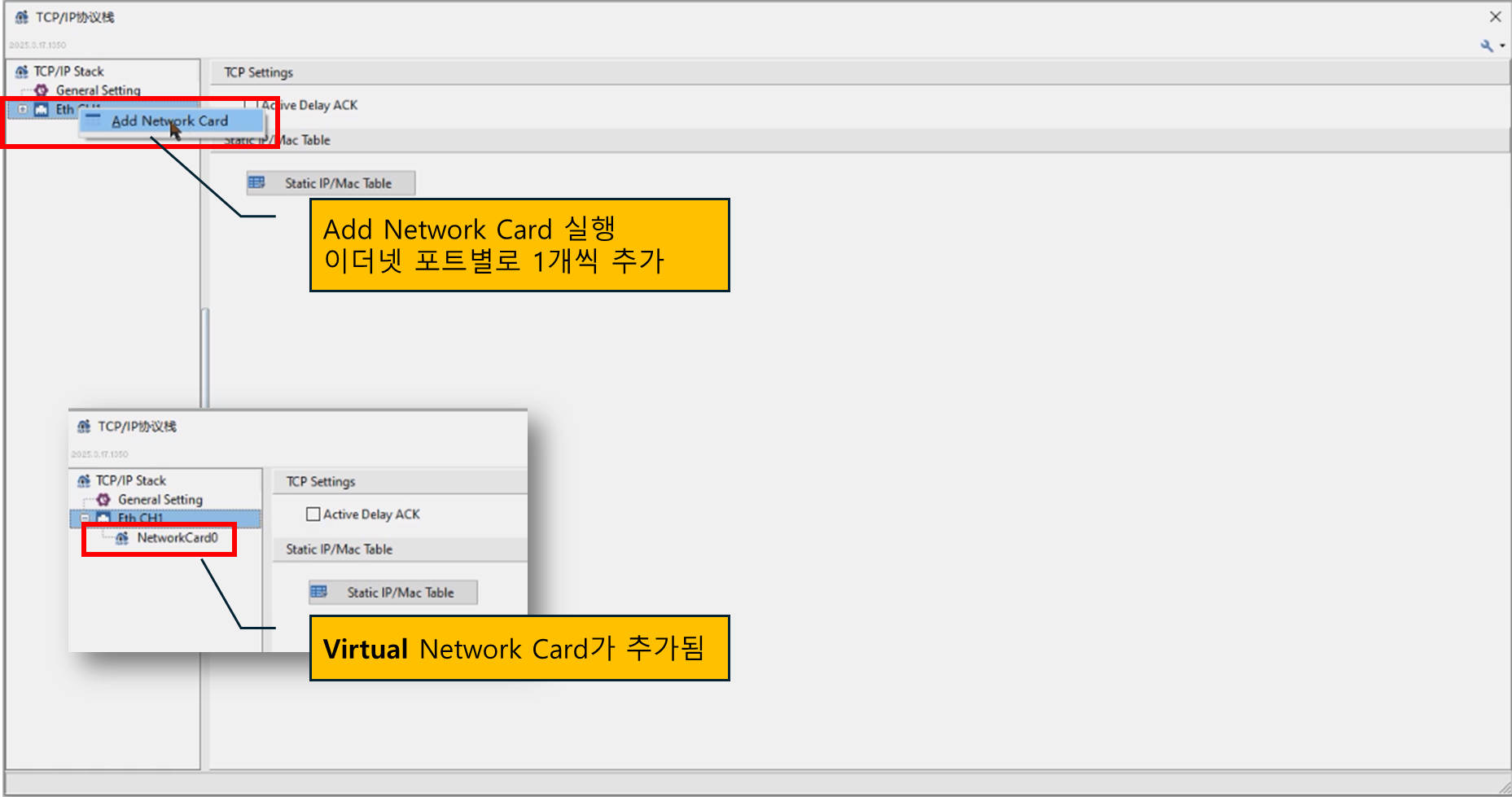 - TCP/IP Stack 설정 창의 왼쪽 영역에 Eth CH1을 선택하고 마우스 우클릭을 하여 Add Network Card를 실행한다. 가상의 네트워크 카드인 NetworkCard0가 추가된다.