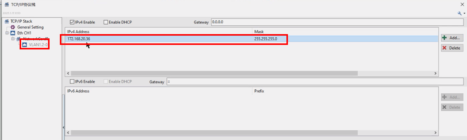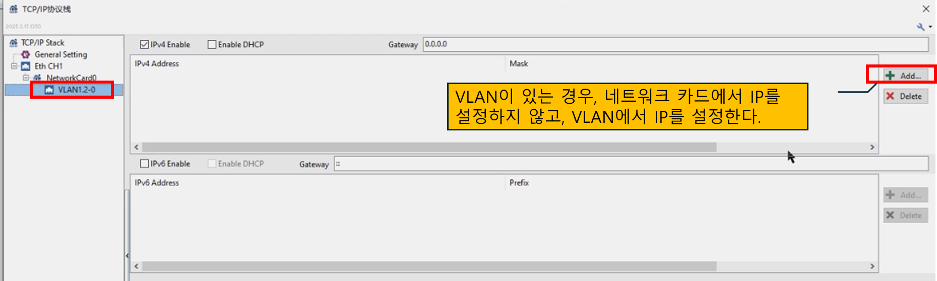 - 추가된 VLAN을 선택하고, 창의 오른쪽에서 Add 버튼을 클릭하여 IP 주소를 설정한다.